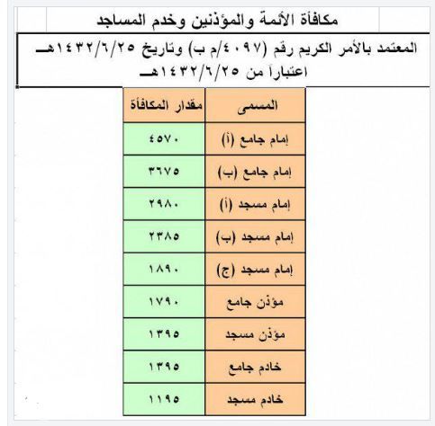 فيما يلي القيم التفصيلية للرواتب الشهرية المعتمدة للأئمة والمؤذنين وخدم المساجد: